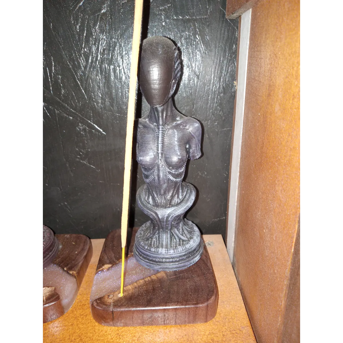 Another Escher-style piece. A bio-mechanical bust. Perhaps NSFW, depends on where you work. 3D-printed and hand-painted on a beautiful Black Walnut and resin base. As always, the wood is harvested and milled by me.