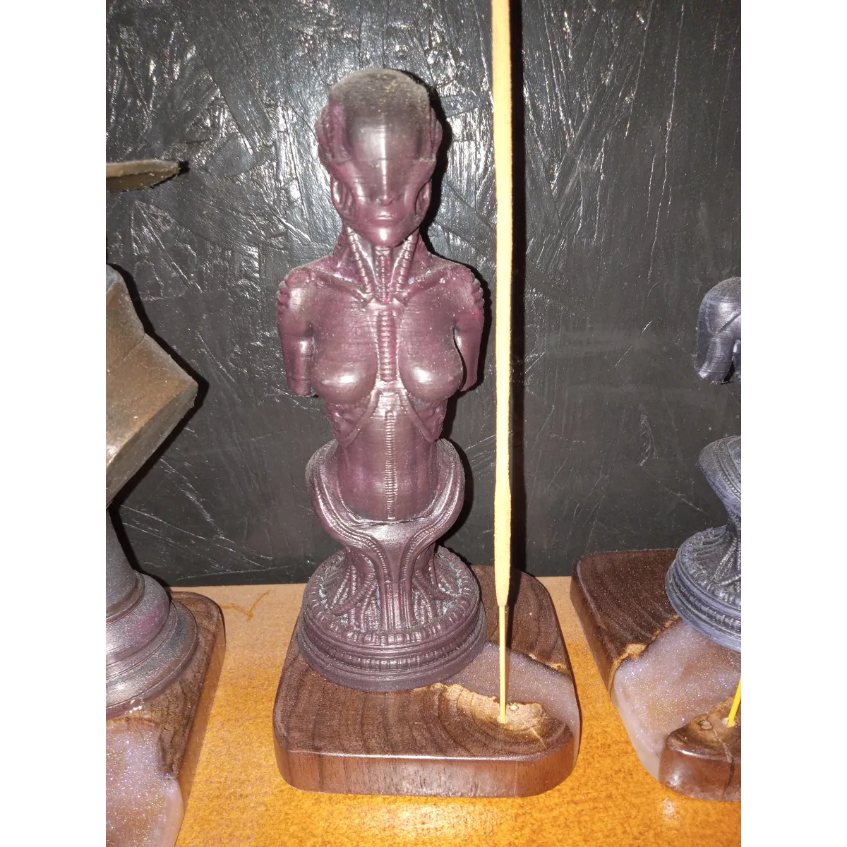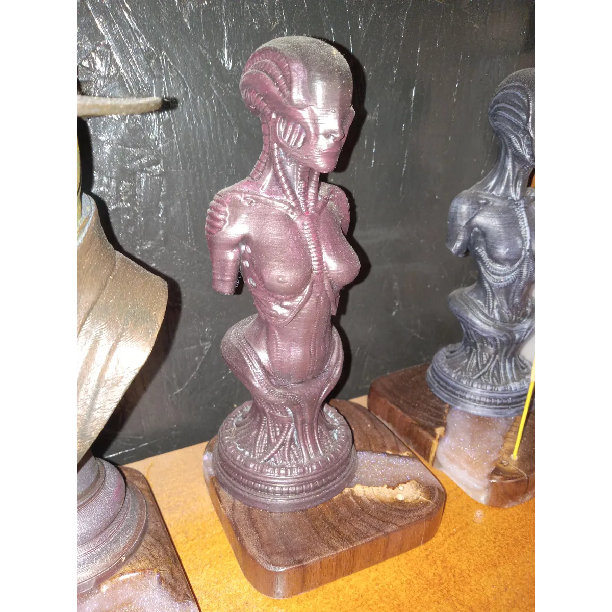 The sister of the Bio-Mech Bust Blue. Another 3D-printing, hand-painted, then placed on a base of locally harvested and milled Black Walnut and resin. This is one of my favorites. Perhaps NSFW
