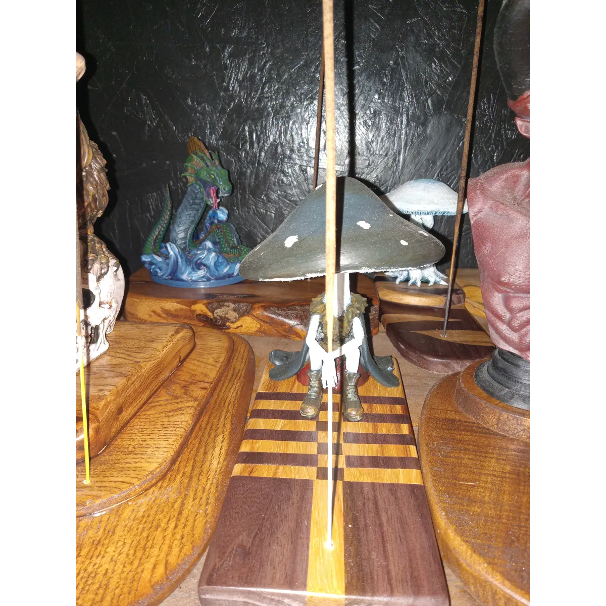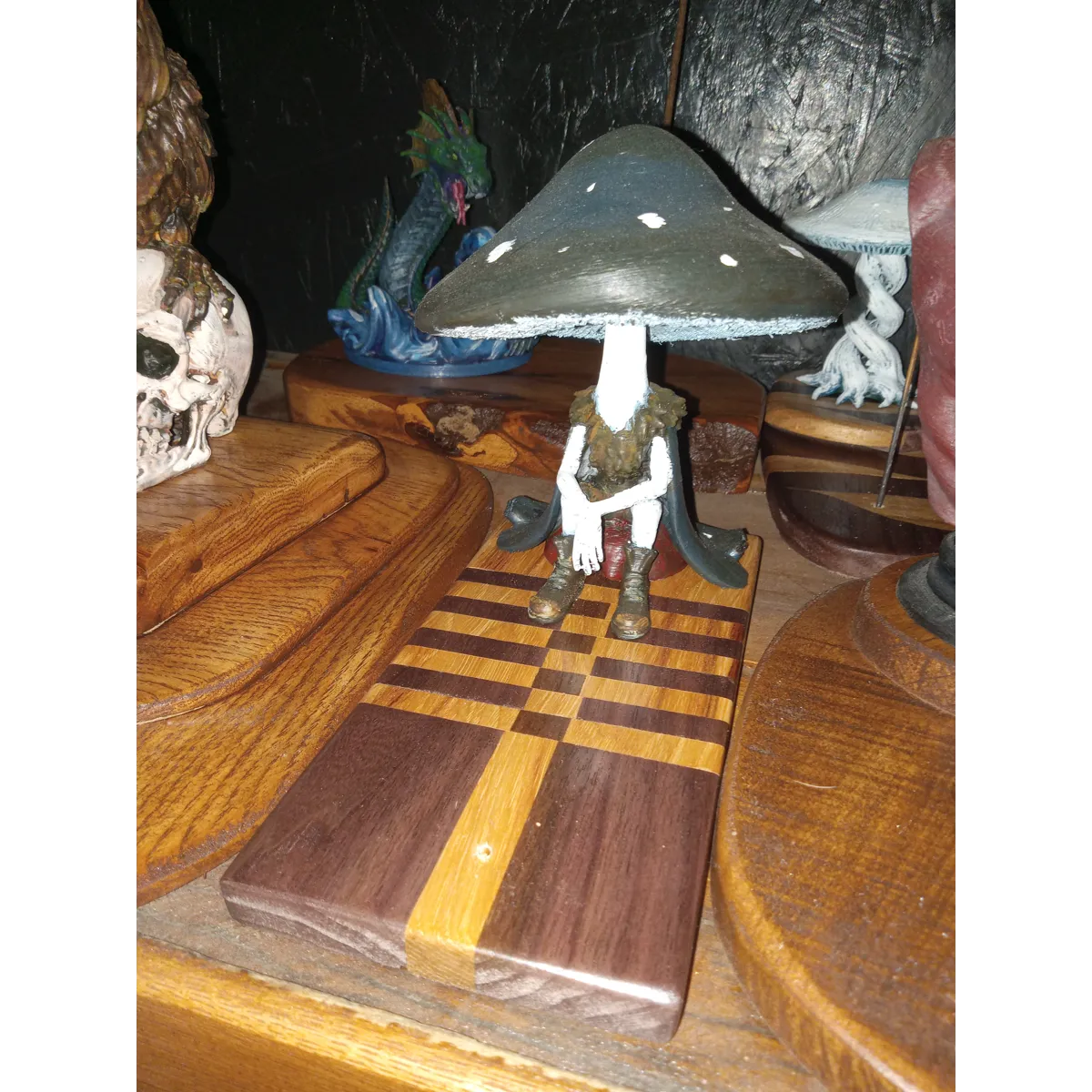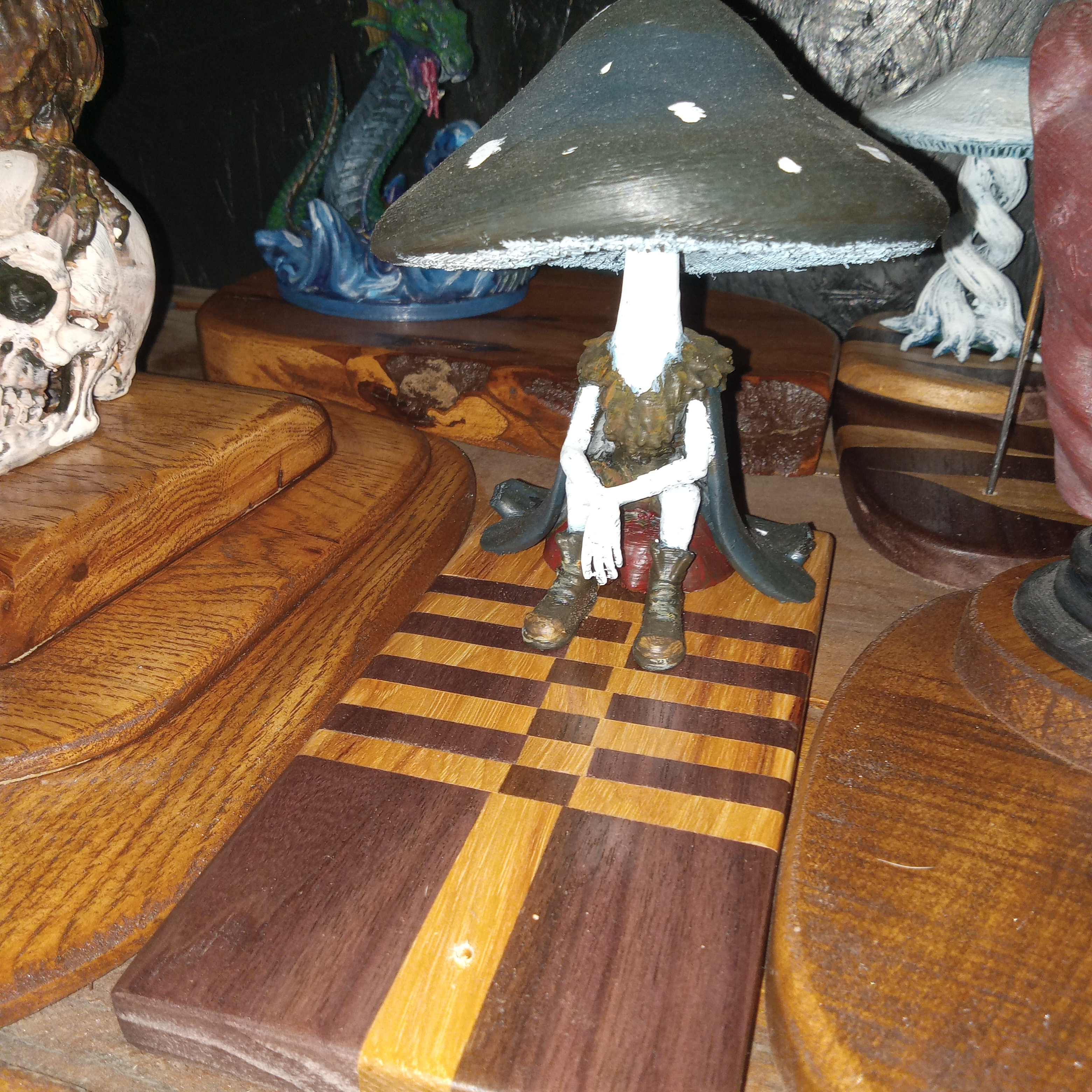 Checkered Hickory and Black Walnut. Locally harvested and milled by me. Topped with the chillest shroom guy ever. He's designed, 3d=printed, and hand=painted by me. Sure to help you make a relaxing space in your home.