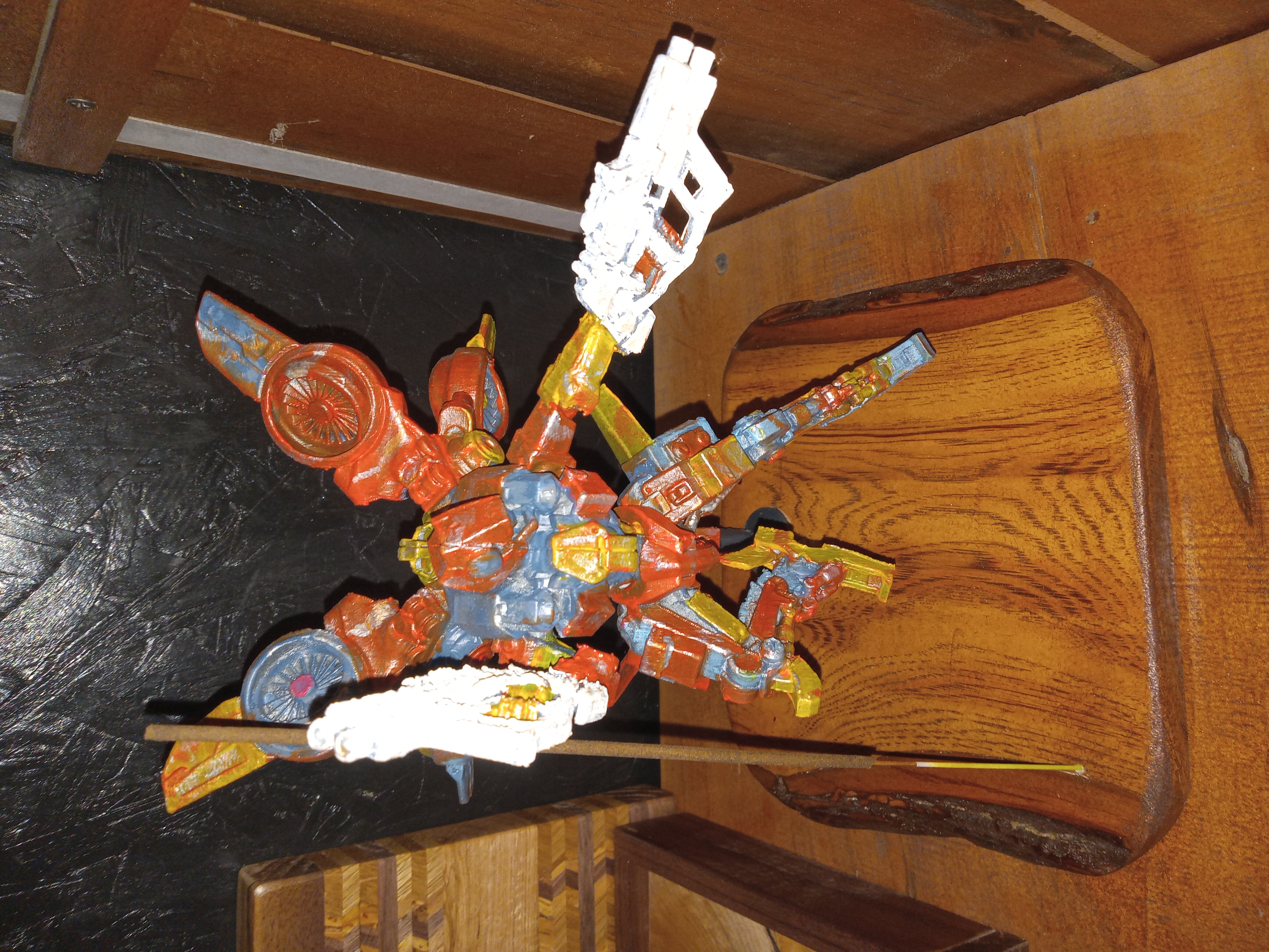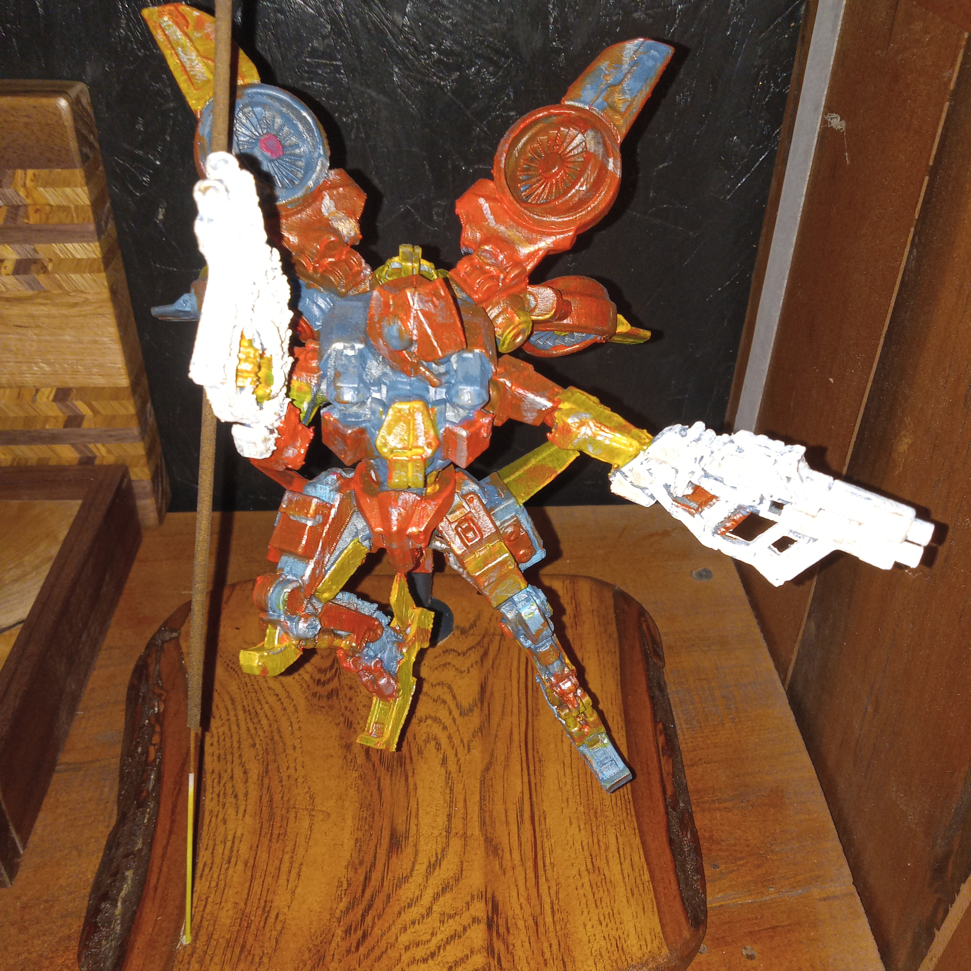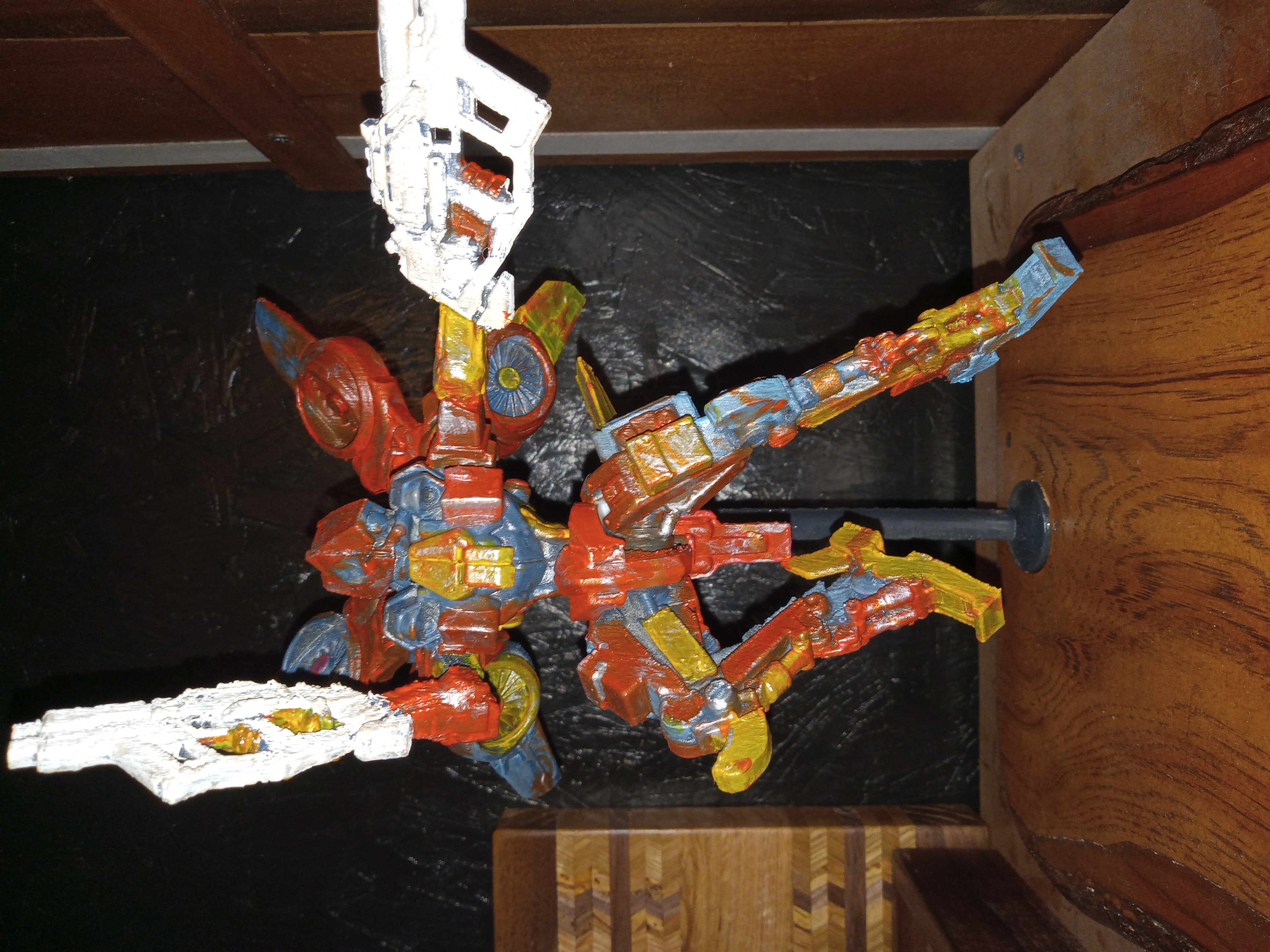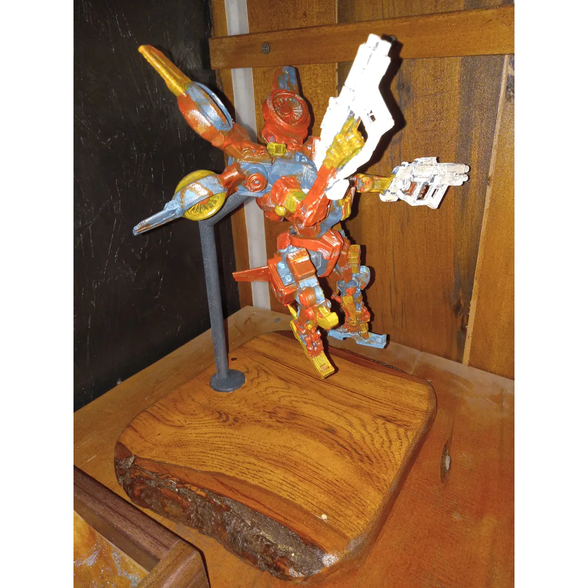 Hand-painted 3d=printed mech straight out of a junkyard. Mounted on an awesome live-edge piece of locally harvested and milled Hickory.