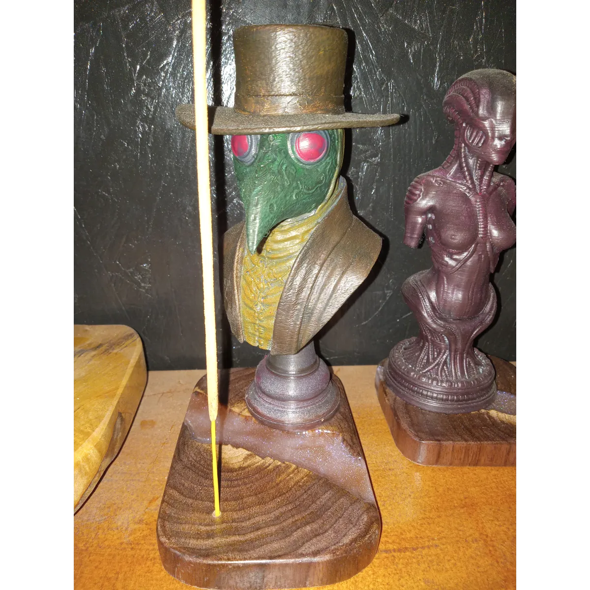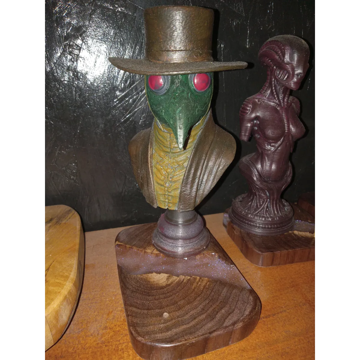 A cool 3D-printed and hand-painted bust of a plague dr. Set on top of some of my locally harvested and milled Black Walnut with a resin fill. I like this piece a lot.