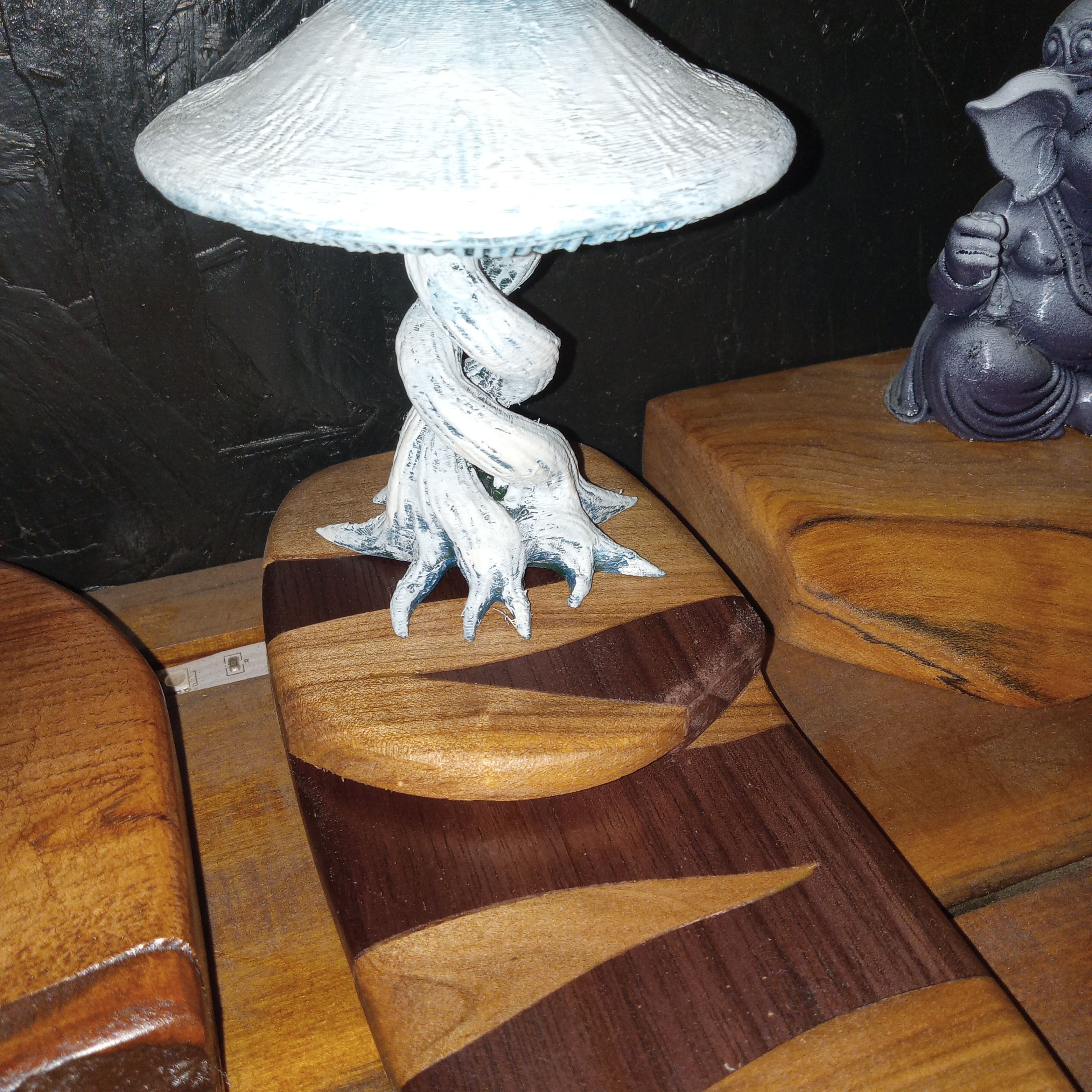 Locally harvested and milled Hickory and Black Walnut. Inlaid and stacked to make a stunning base for a magical hand-painted and 3d=printed mushroom.