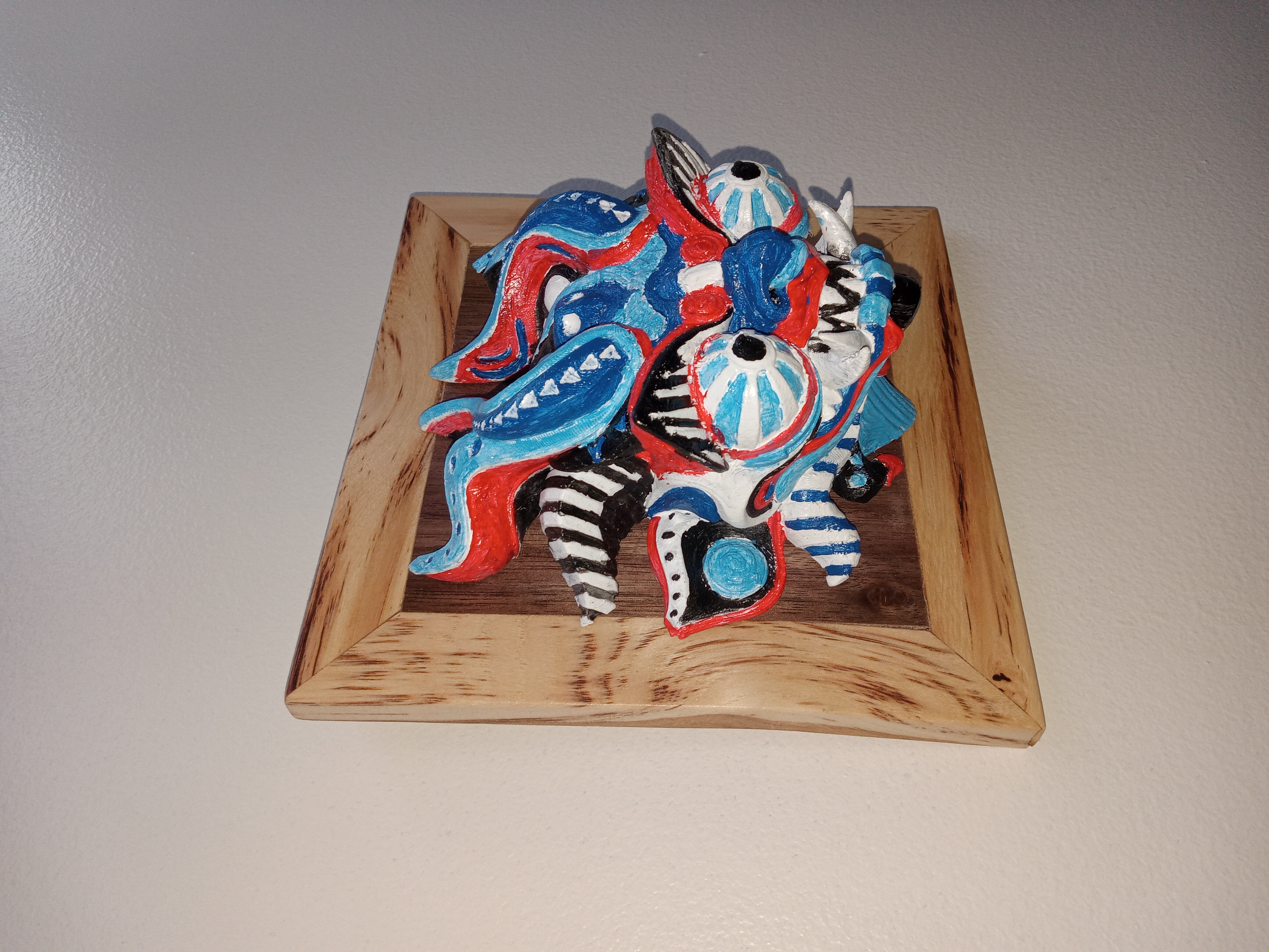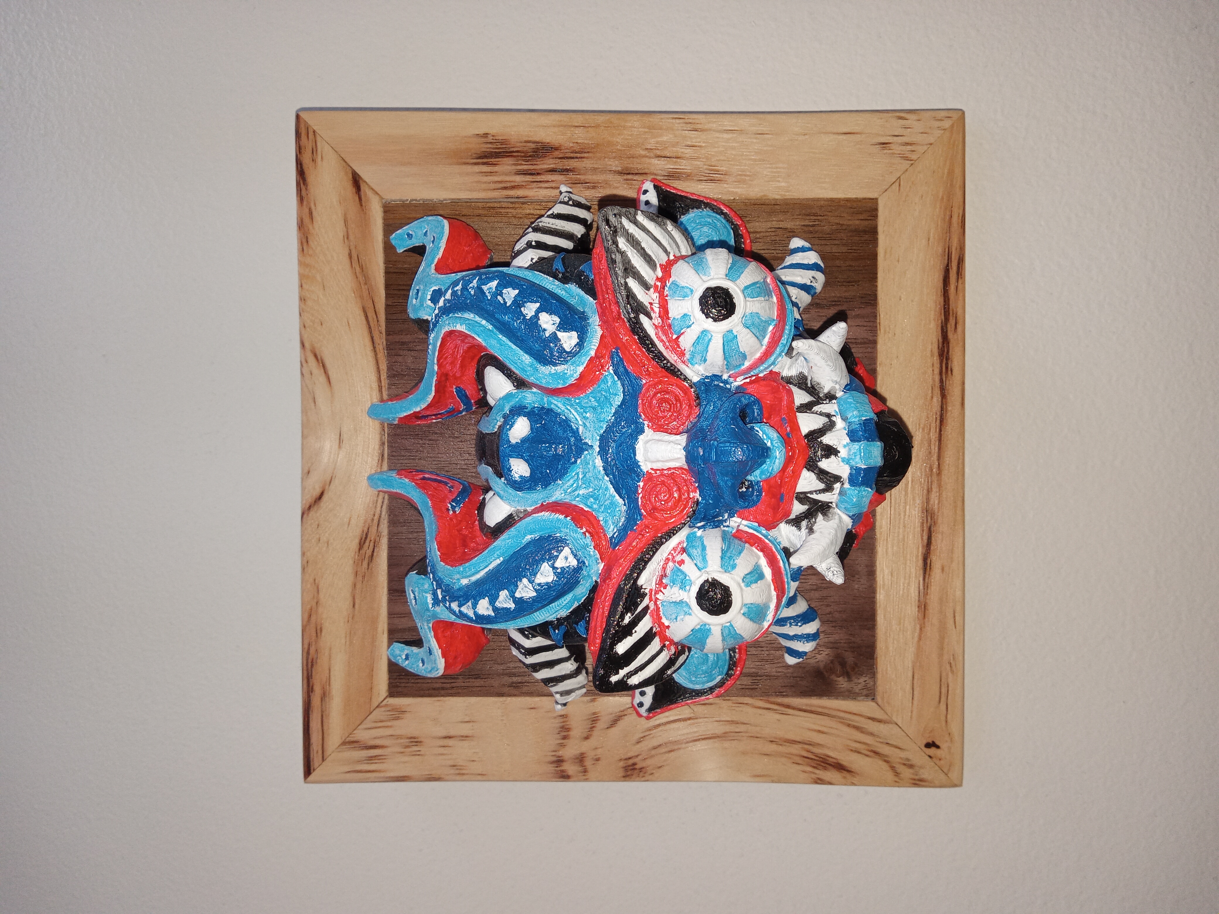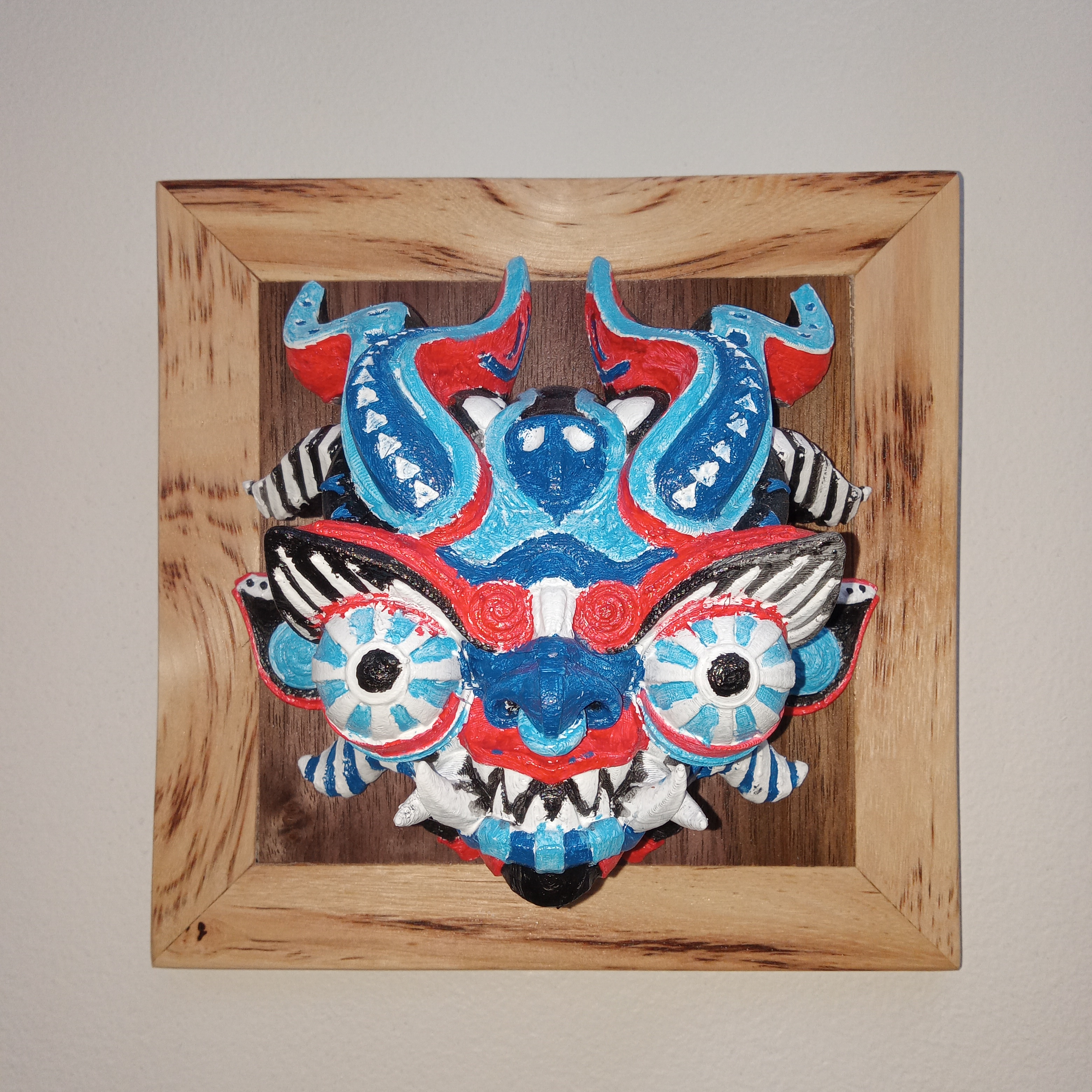 Hickory frame with a Black Walnut center. Holding a hand-painted Dragon. Sure to make any wall pop.