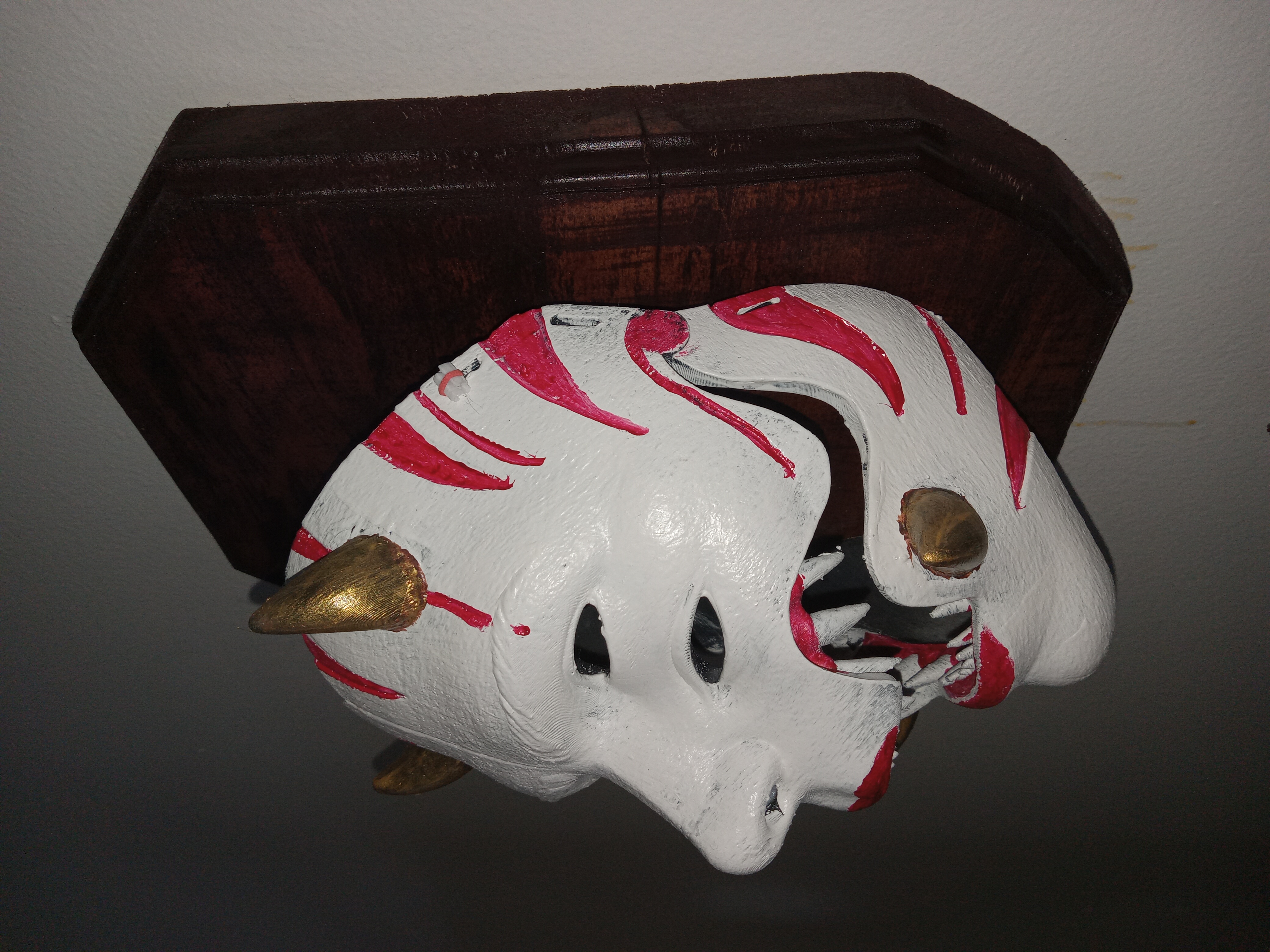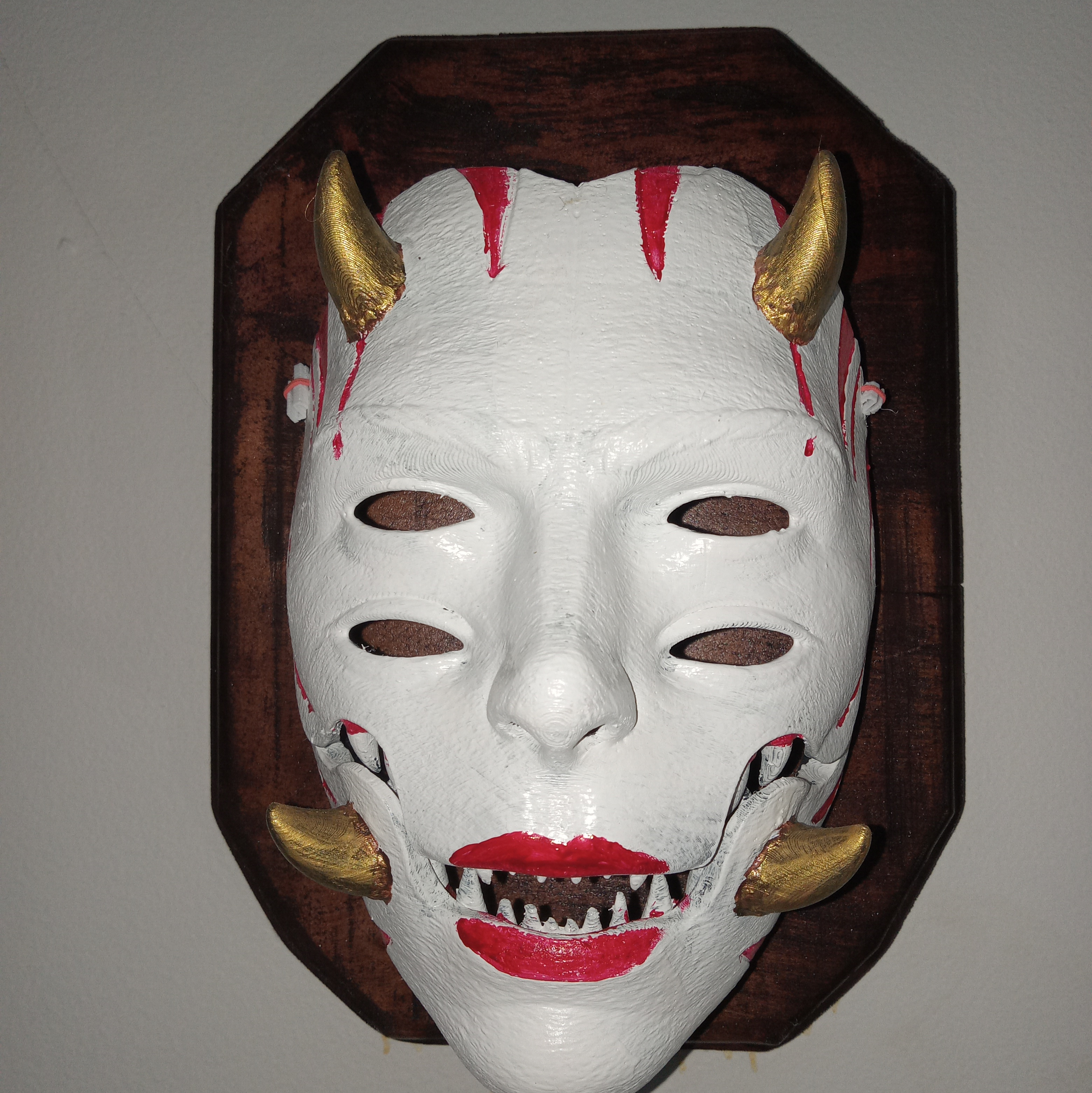 Spalted Maple, locally harvested, milled, shaped, and finished. Used as a backing for a 3D-printed Oni mask (child-sized). The mask is removable but not strapped for wearing. Hand-painted.