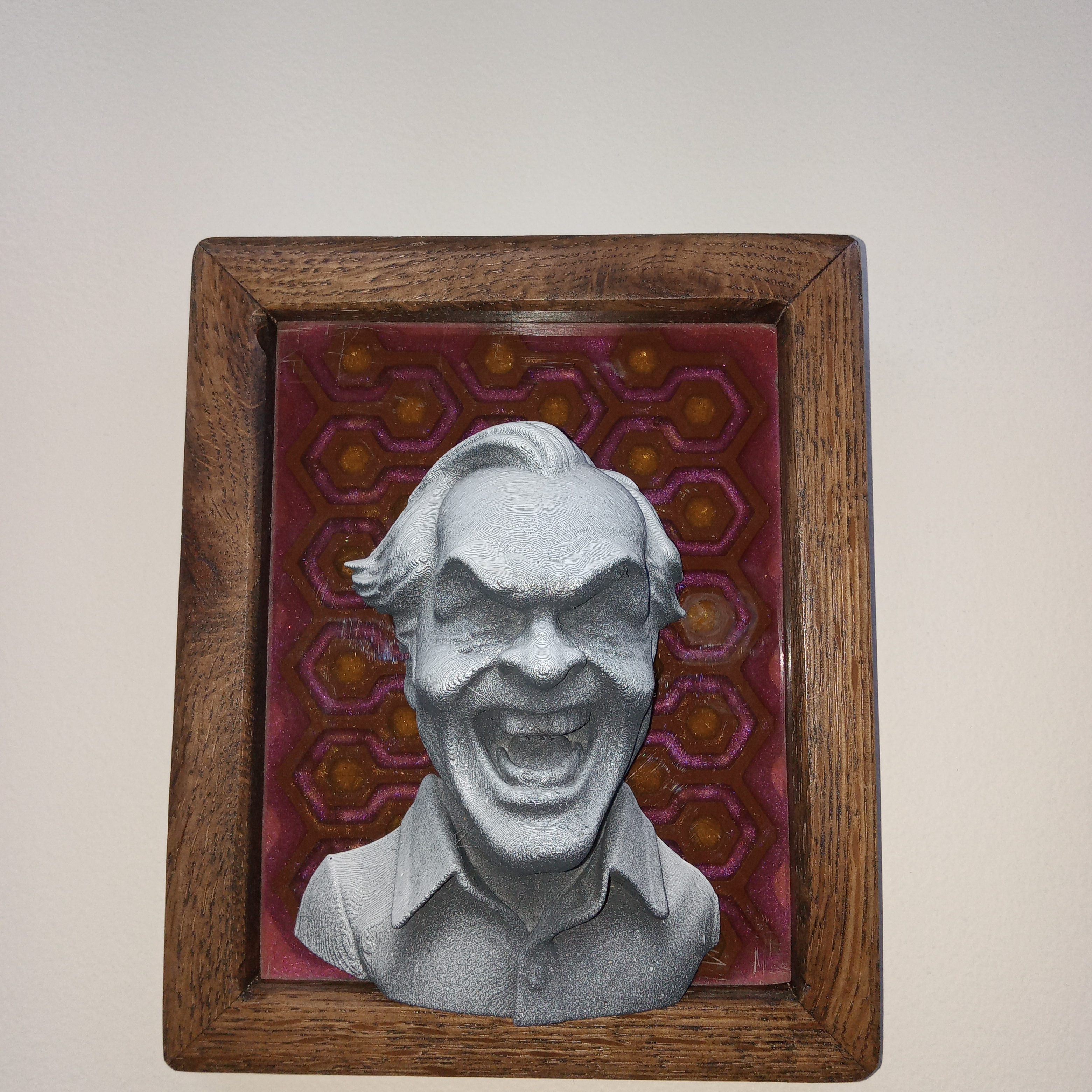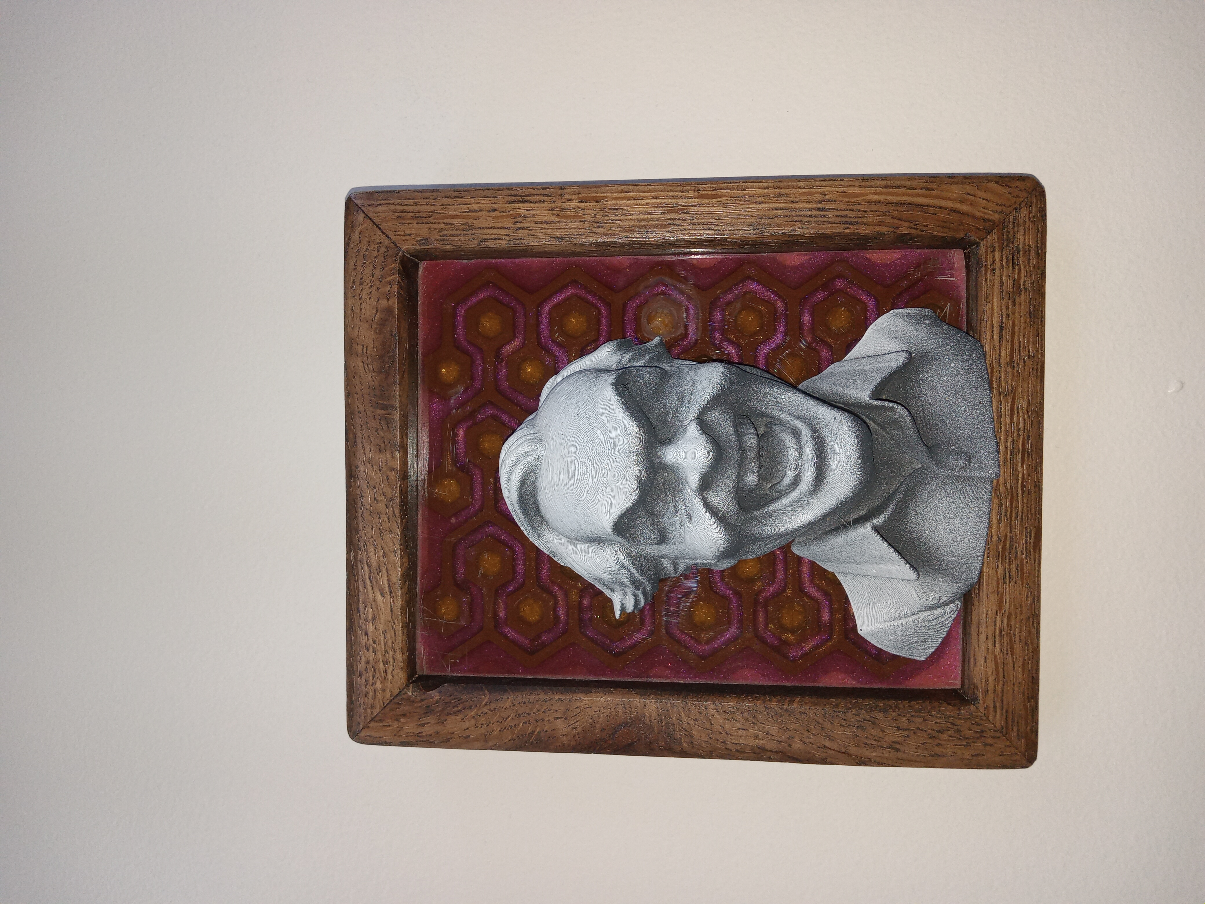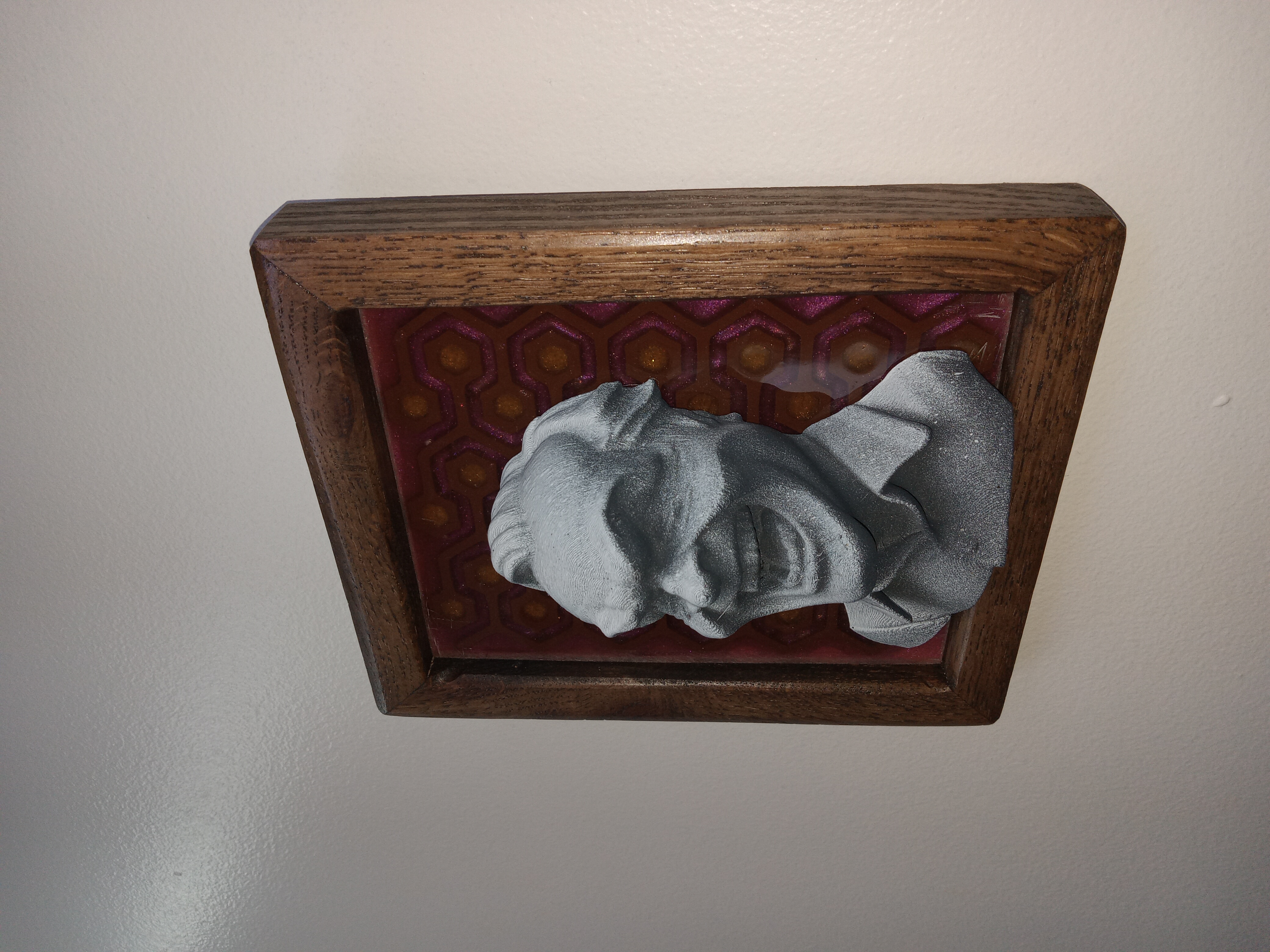 Stained Oak frame with a poured resin center with the pattern of the famous carpet inside. A 3d Printed Jack is popping out, ready to play.
