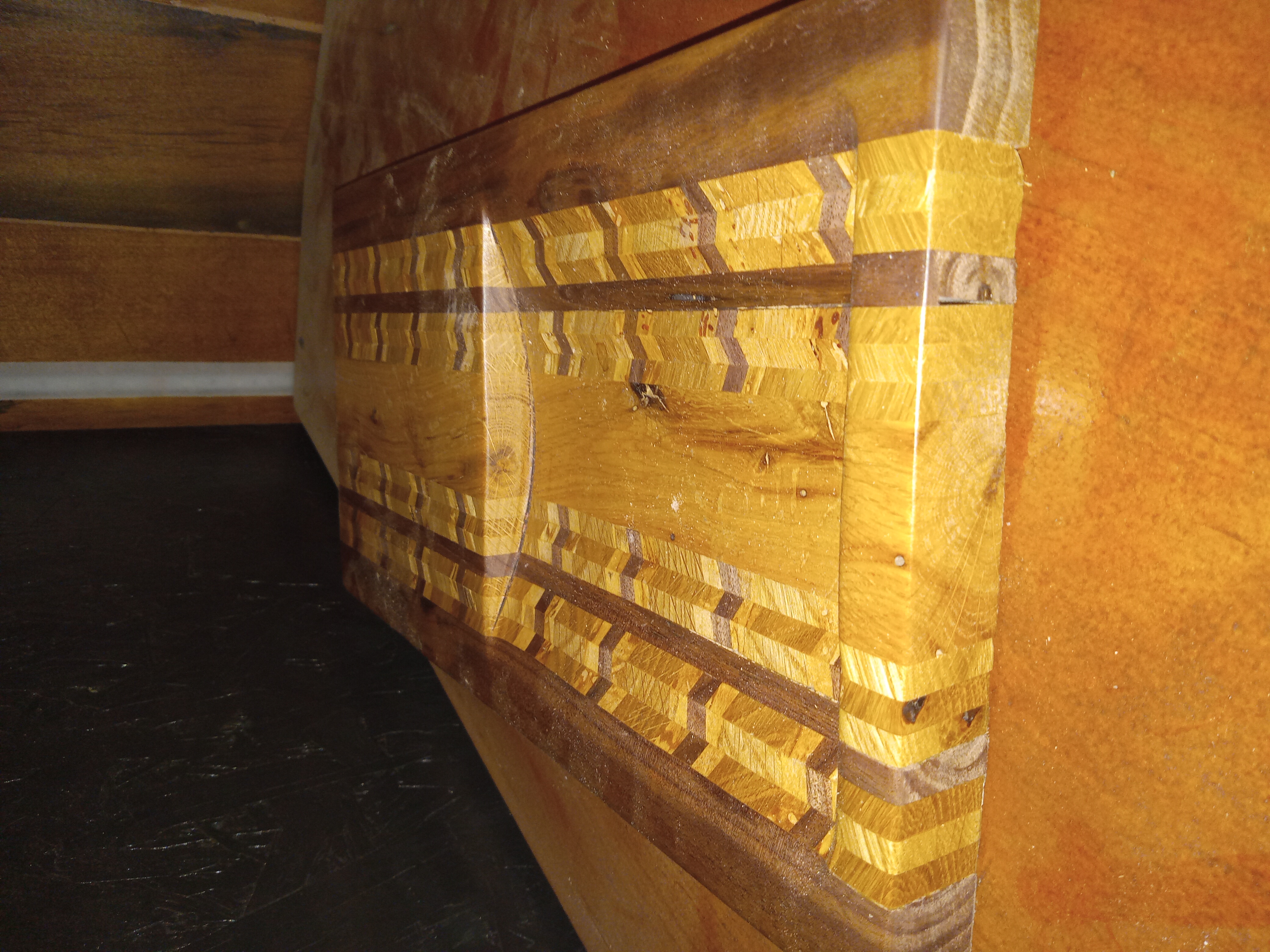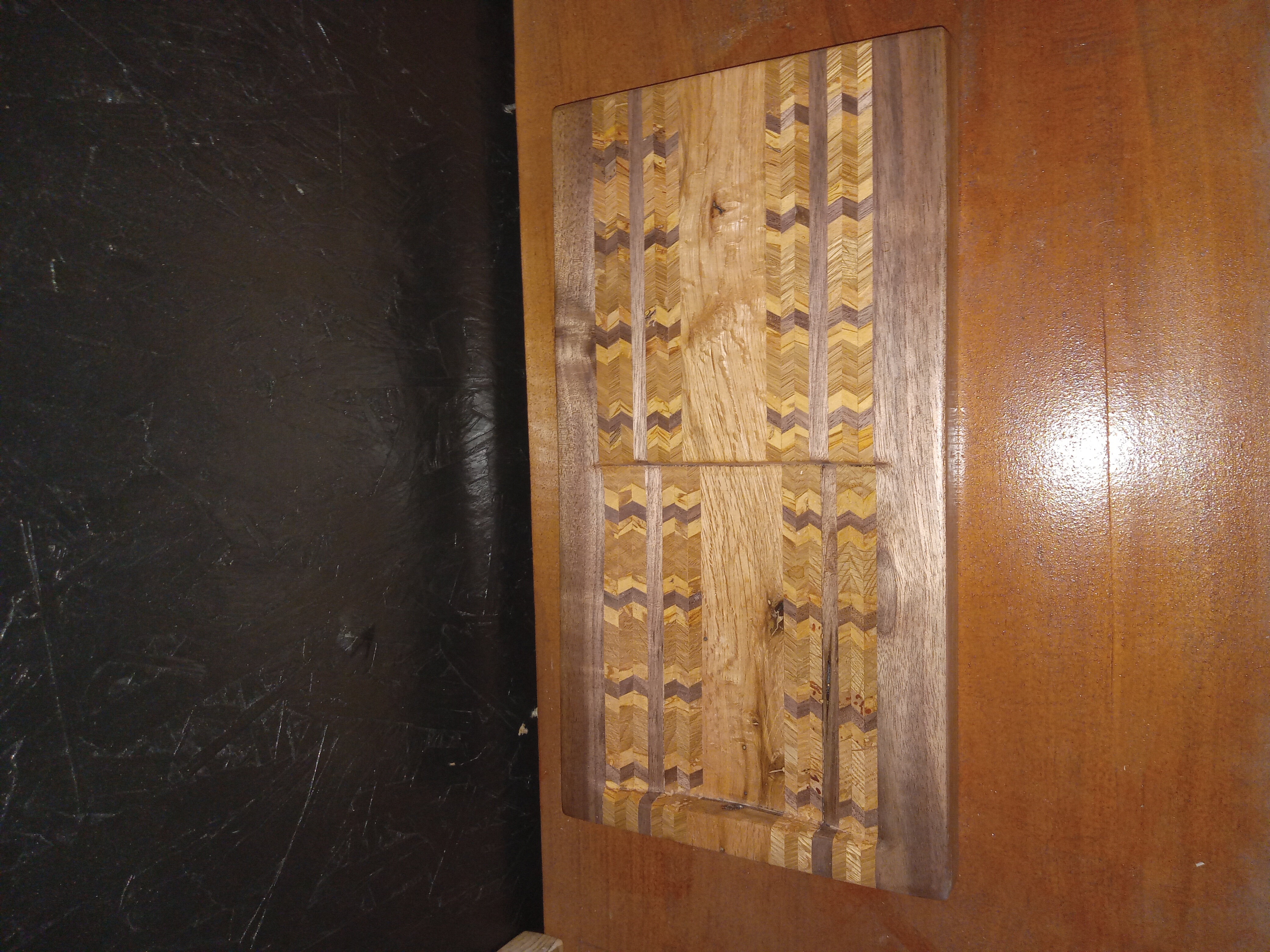 Oak, Silver Maple, Hickory, and Black Walnut come together in this very unique piece. It could be used as a tray for keys or just about anything you can think of. The bottom is left unfinished while the rest is sanded and covered with a thin coat of poly for protection.